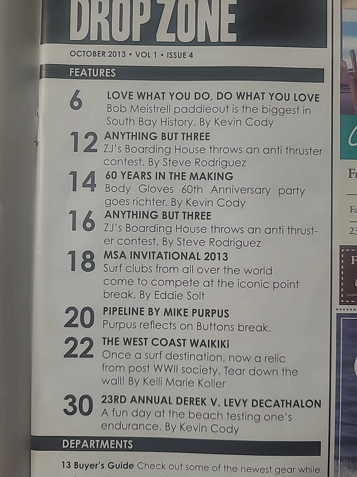 October 2013 issue of Drop Zone LA, this features Bob Meitrell paddle out, Body Glove 60th anniversary party, Malibu Surfing Association Invitational, ZJ Boarding House surf Contest, and more... see the photos of the table of contents