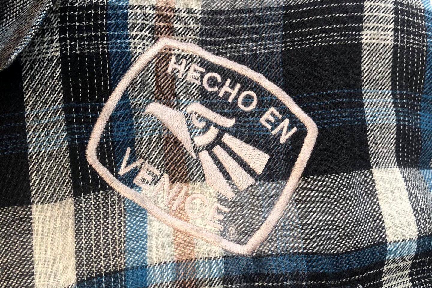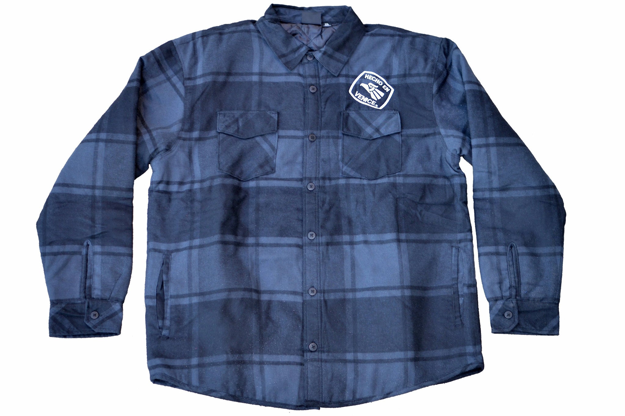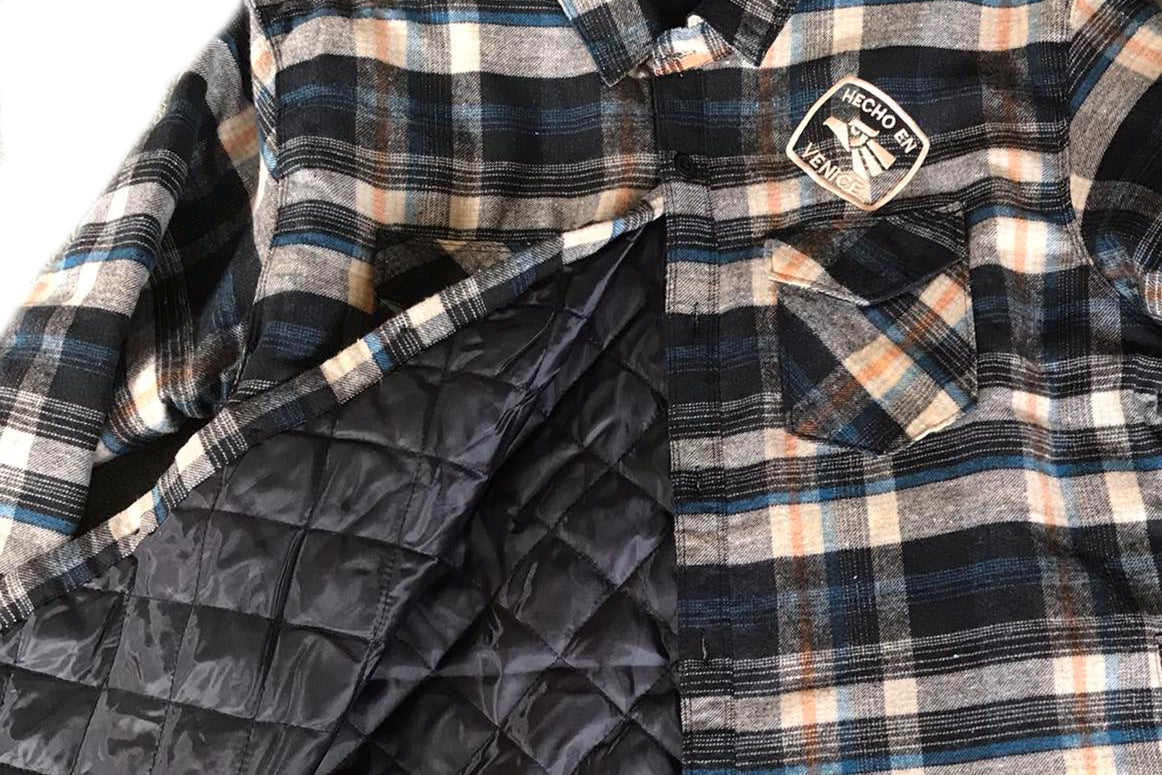 Heavy duty, warm lined flannel jacket with Hecho En Venice embroidered above the left pocket.