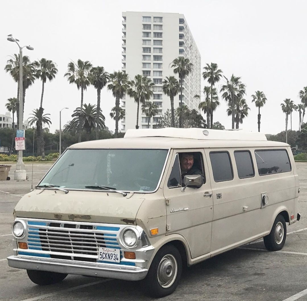 In the foreground is Badger's beloved 1969 Ford Econoline Super Camper Van, and in the background are the famous Pacific Shore Towers, a longtime Ocean Park landmark.