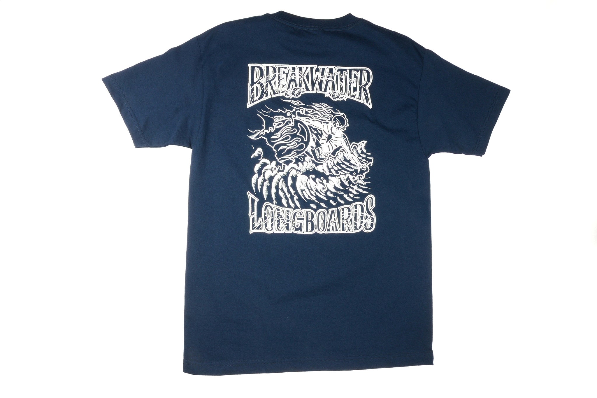 Breakwater Longboards tee from Hecho En Venice feature the Longboards graphic on the back, and the Venice Breakwater Surf/Skate/Snow graphic on the front left chest.